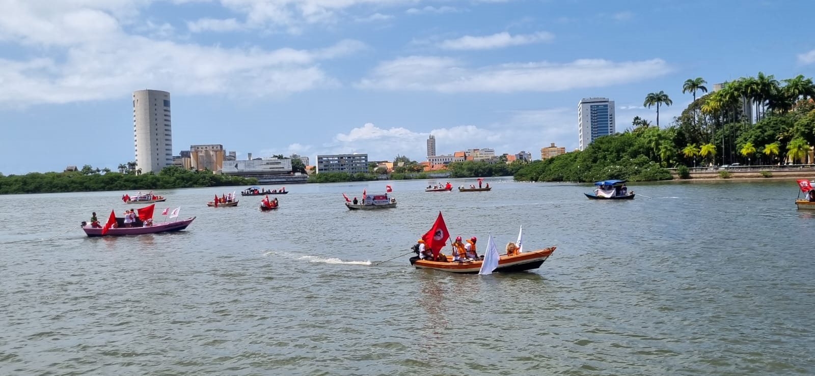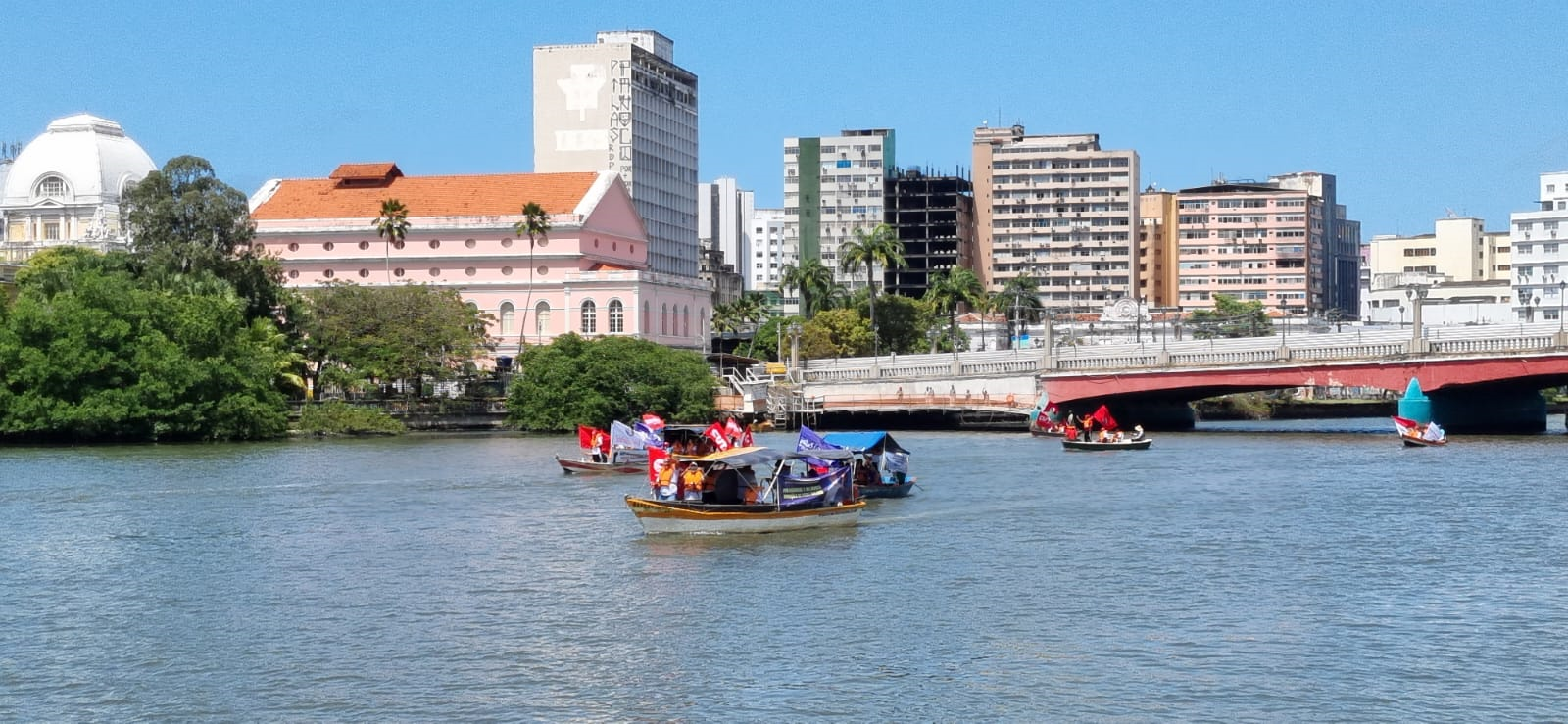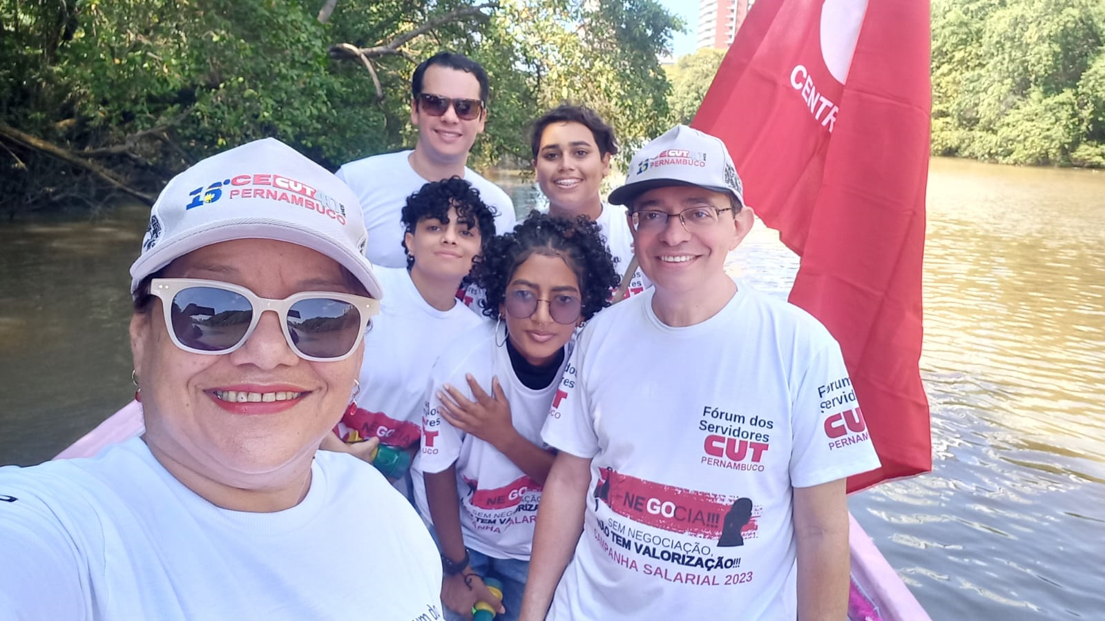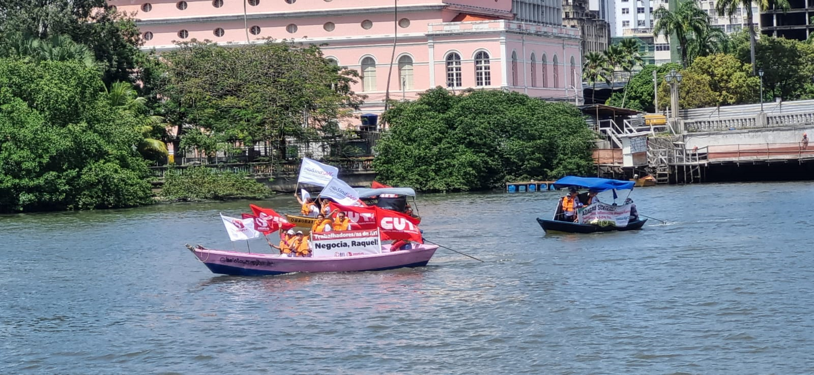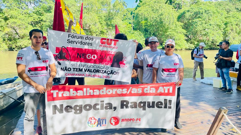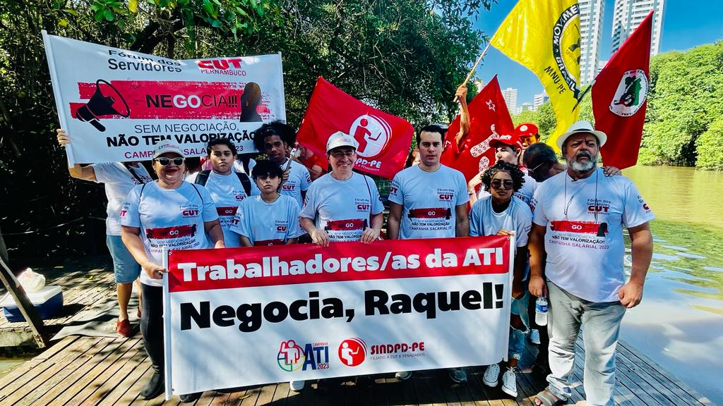 Um protesto diferente e com muita visibilidade ocupou o Recife na manhã desta quarta-feira (23/8). Os vários sindicatos que compõem o Fórum dos Servidores de Pernambuco, coordenado pela CUT, dentre eles, o SINDPD-PE, promoveram uma Barqueata no rio Capibaribe, exibindo faixas, bandeiras e camisetas com a frase “Negocia, Raquel”! O objetivo do protesto foi pressionar a governadora Raquel Lyra a finalmente dar início às negociações sobre a pauta de reivindicações da categoria e denunciar o descaso do governo atual com os servidores e servidoras públicas. Com as negociações gerais suspensas, também estão paralisadas as discussões sobre pautas específicas por empresa, como a dos/as empregados/as da ATI, empresa estadual de TI, o que traz prejuízos às categorias.